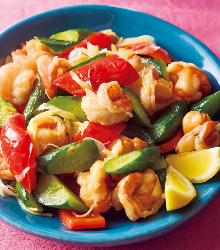 彩り鮮やかな野菜にえびを合わせた、うまみたっぷりの蒸し炒め。少ない水分でサッと火を通すから、栄養も味わいもぎゅっと凝縮。しょうがの香りが全体をキリッと引き締めてくれます。