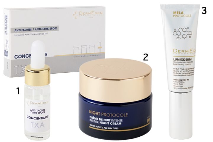 1.DermEdenTXA5% 3本(30ml)¥19,800はナイアシンアミドとトラネキサム酸が最高濃度の美容液。2.DermEden INTENSE NIGHT CREAM ¥13,200はレチノール、ナイアシンアミド、グリコール酸、サリチル酸によって肌の若返りを促す究極アンチエイジングクリーム。3.ルミックスダーム¥13,200はブライトニング成分であるルミキシルペプチドによるホワイトニングクリーム。ピンポイントでシミ部分に塗布することにより薄くなります。