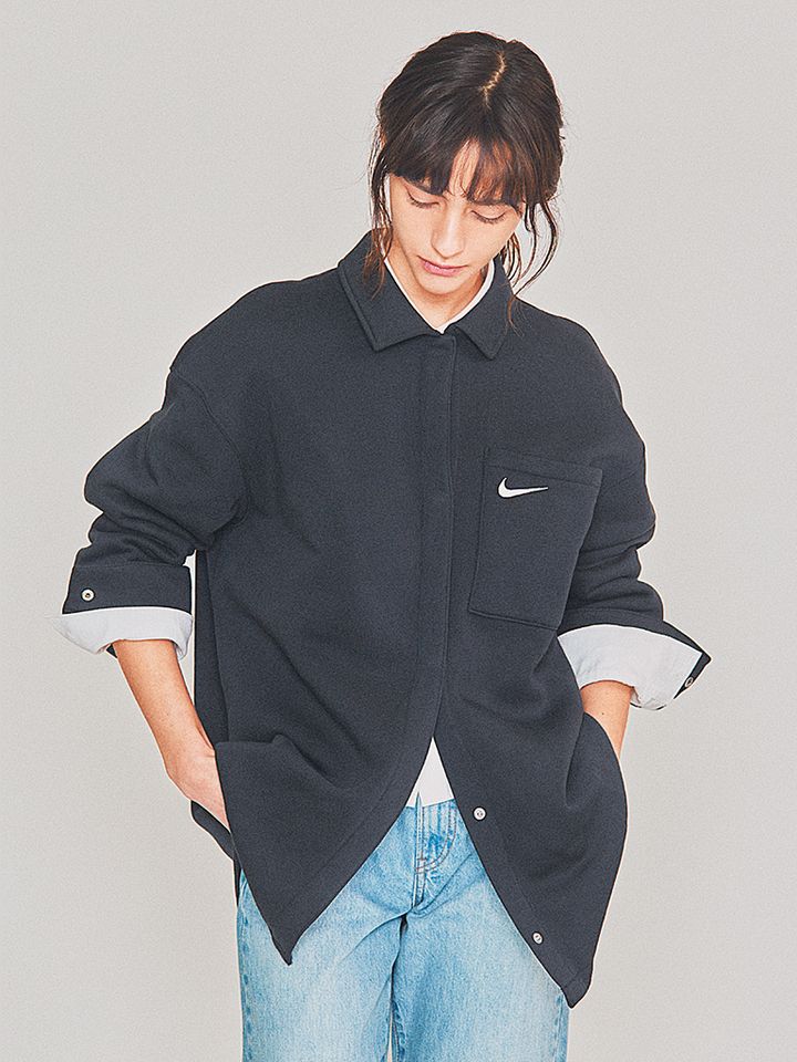 黒シャツスウェット/ナイキ スポーツウェア(NIKE カスタマーサービス) 中に着たシャツ/UNIQLO and JW ANDERSON(UNIQLO) スウェットらしくないキレのあるディティールで、ちょうどいいあんばいのハンサムさ。厚みのあるオーバーサイズだから、ちょっとした羽織りとしても重宝。