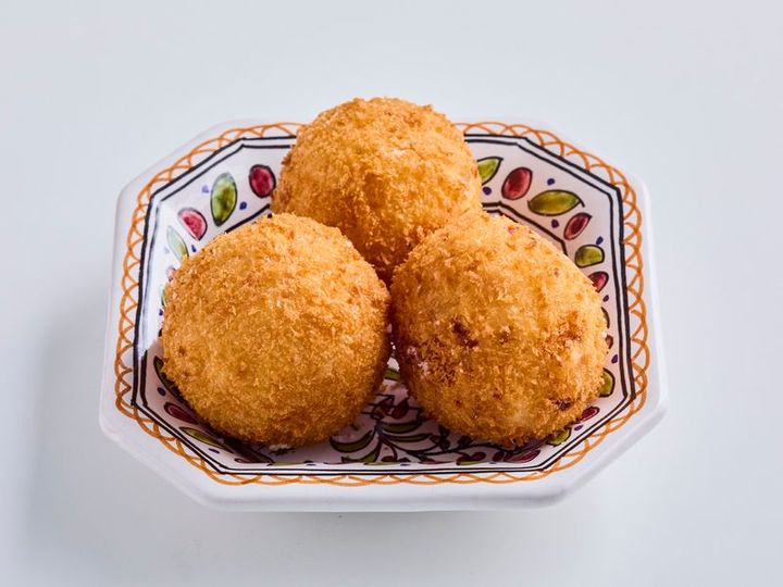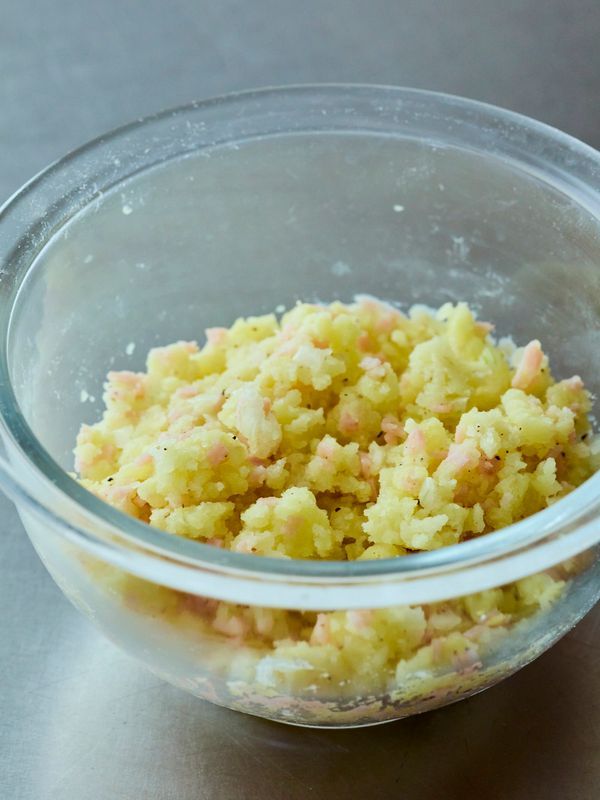 じゃがいもは皮をむき、3cm角に切る。耐熱のボールに入れ、ふんわりとラップをして電子レンジ(600W)で3分ほど加熱し、柔らかくなったらマッシャーなどでつぶす。熱いうちにハム、玉ねぎ、牛乳と、バター2g、塩ひとつまみ、粗びき黒こしょう適宜を加えて混ぜ、さめたら3等分してボール状に形を整える。
