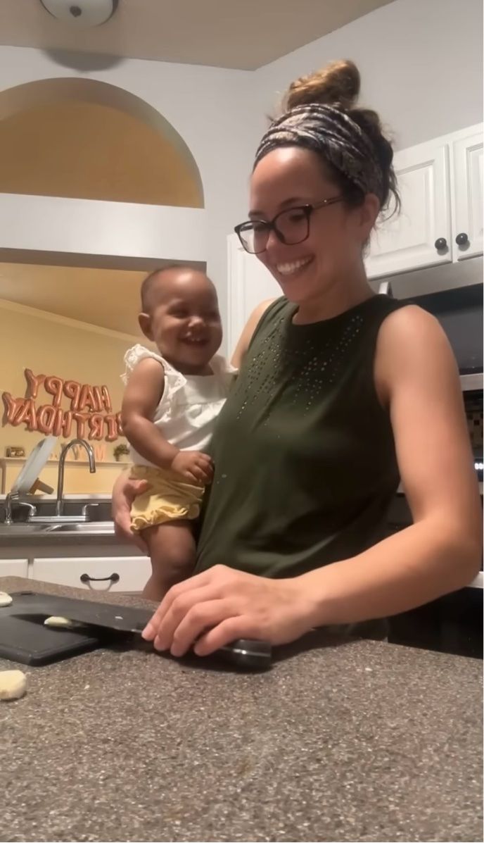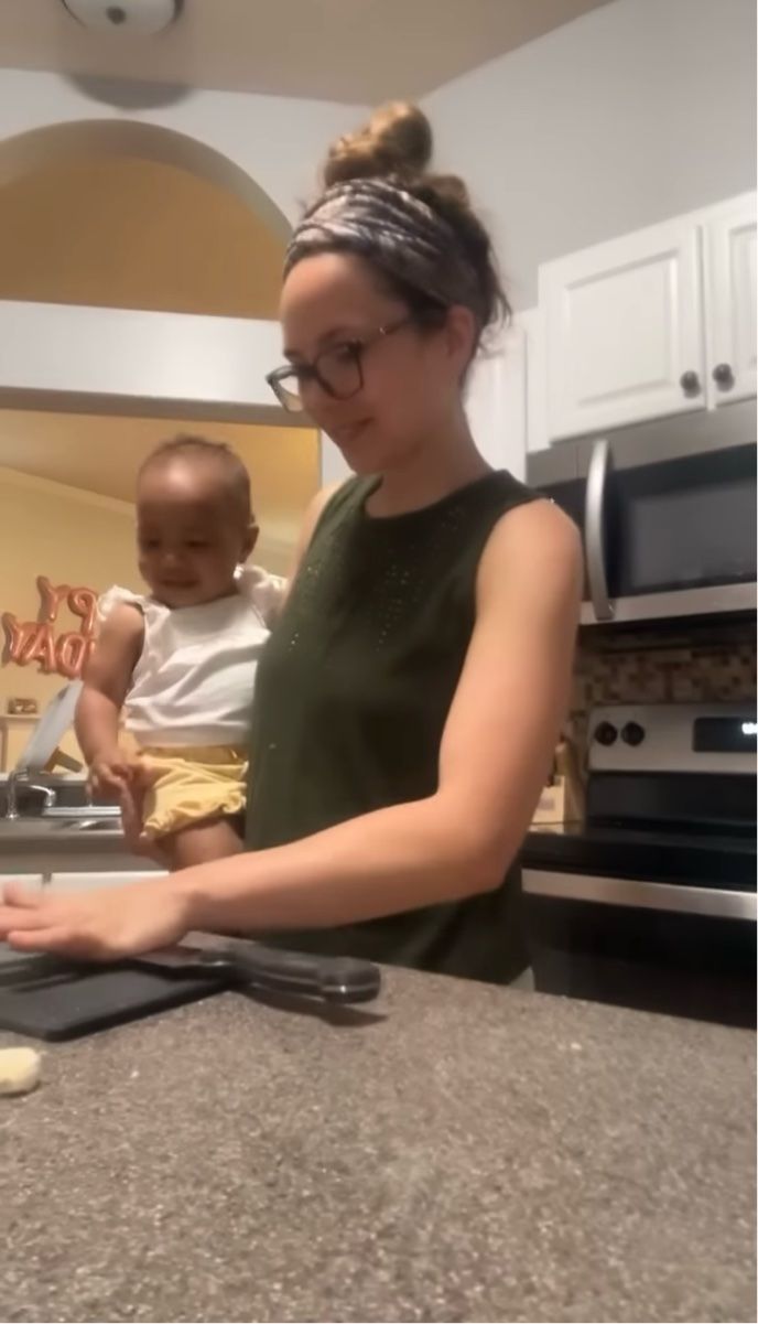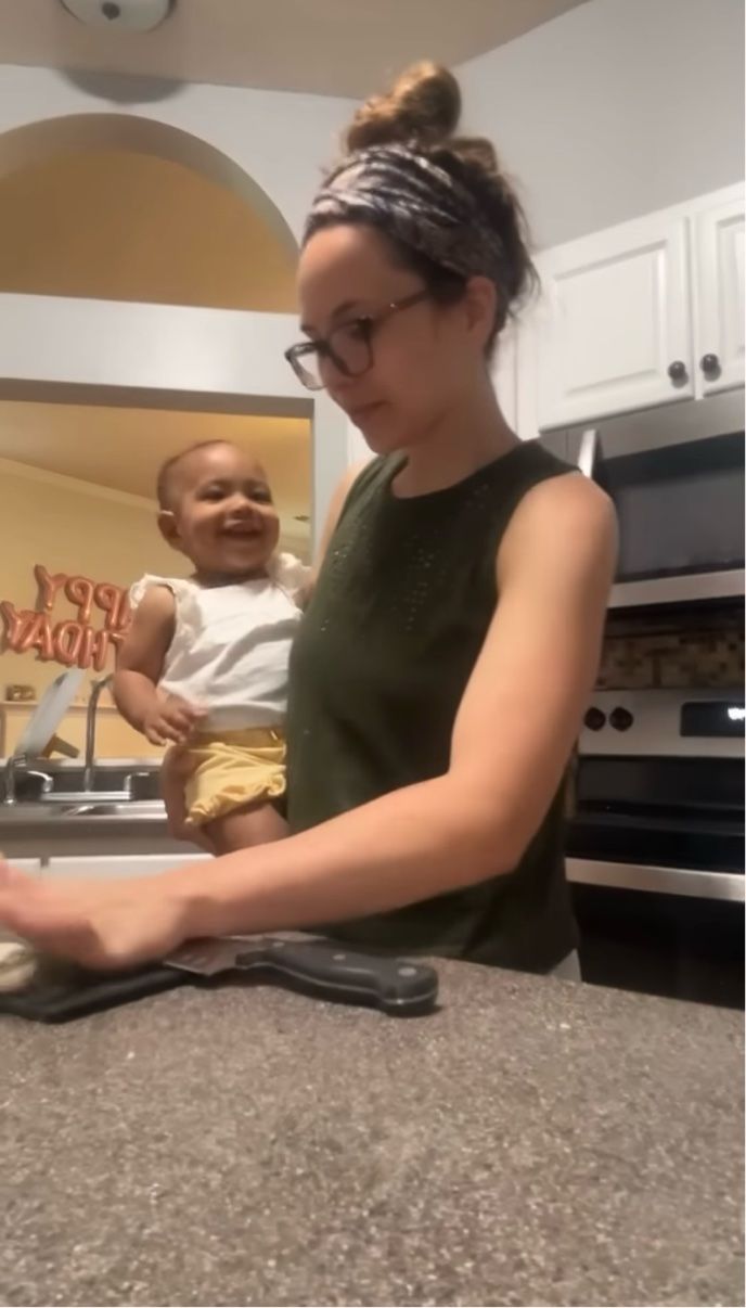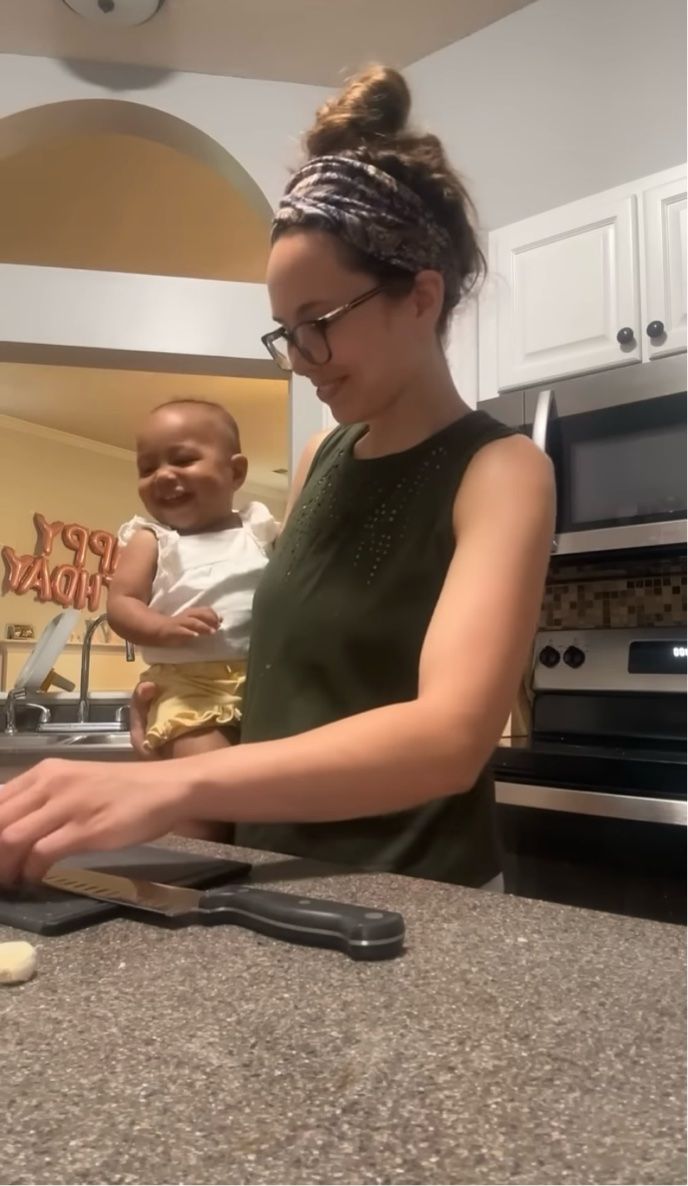 包丁を叩く仕草なのか、ニンニクがつぶれた時の音なのか、何かが赤ちゃんの笑いのツボにドンピシャだったようです。 そんな赤ちゃんにつられるようにして、ママも一緒に笑ってしまうのでした。