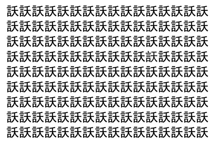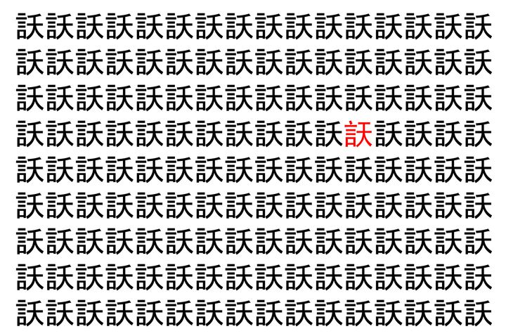 画像の中には、「訞」という漢字が縦に9行、横に16個並んでいます。 全部で144個となりますが・・・、そのうち1つは「異なる漢字」となってますよ!!