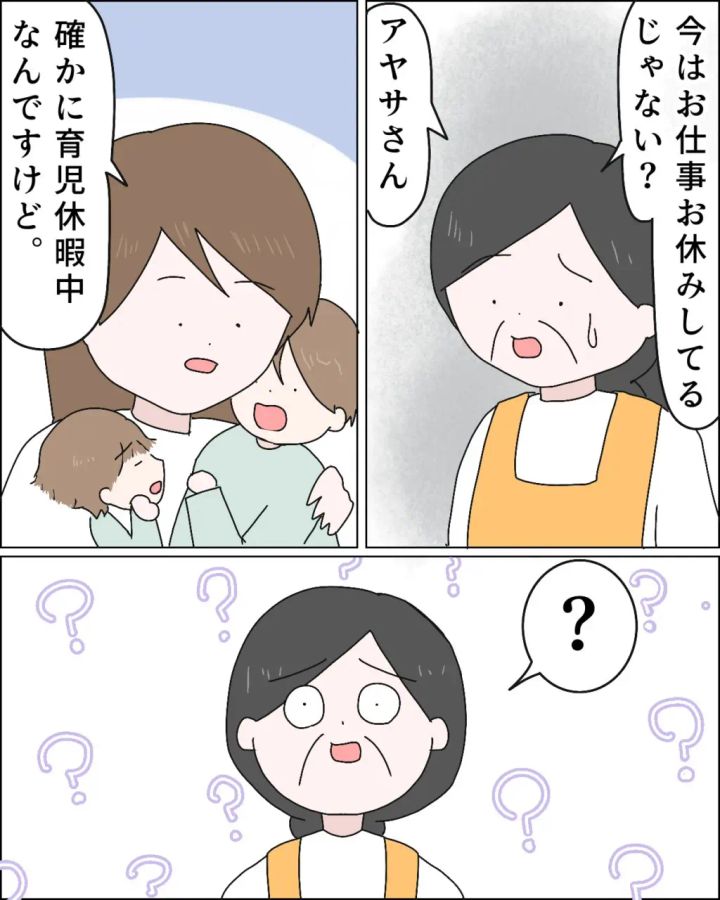「今はお休みしてるじゃない?アヤサさん。」と、納得いかない様子の義母に「確かに育児休暇中なんですけど」と私は説明しました。