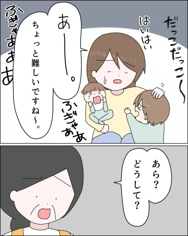 「あー。ちょっと難しいですね。」とハッキリ答えた私。そうしている時にも、泣き止まないナツキをあやし、抱っこをせがむチアキの相手をしなければいけません。玄関までユキヒロを見送れない私に不満そうに理由を聞いた義母に