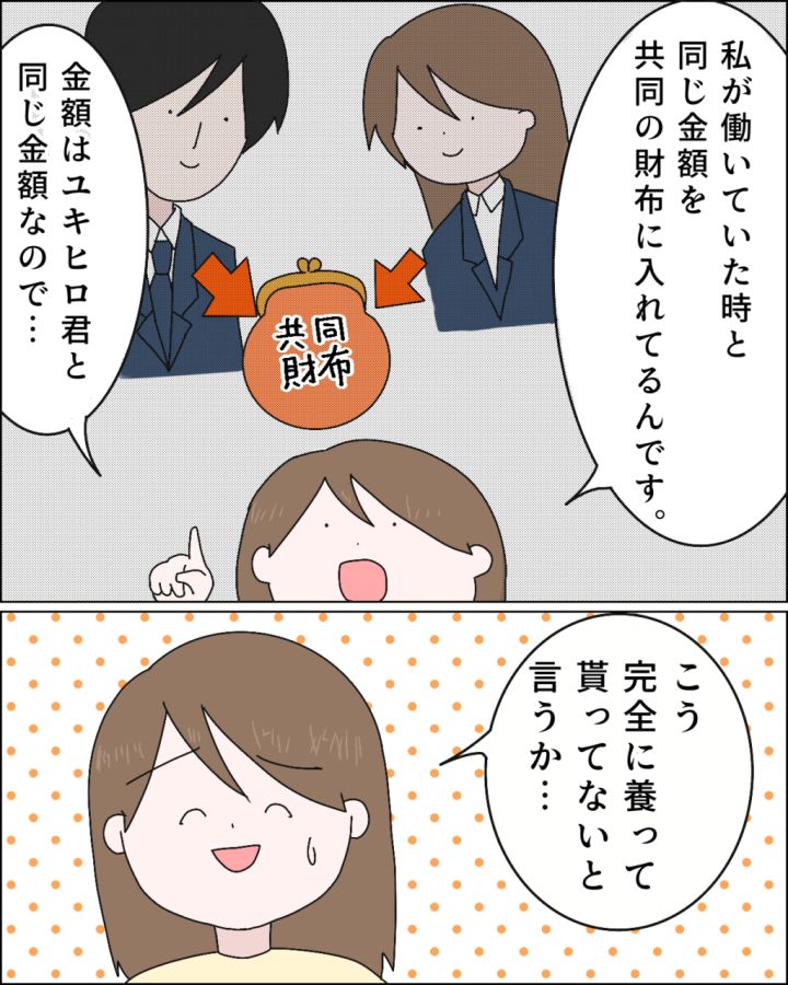 「私が働いていた時と同じ額を共同の財布に入れてるんです。金額はユキヒロ君と同じなので、こう、完全に養ってもらってないというか・・・」説明しながら思わず苦笑い。