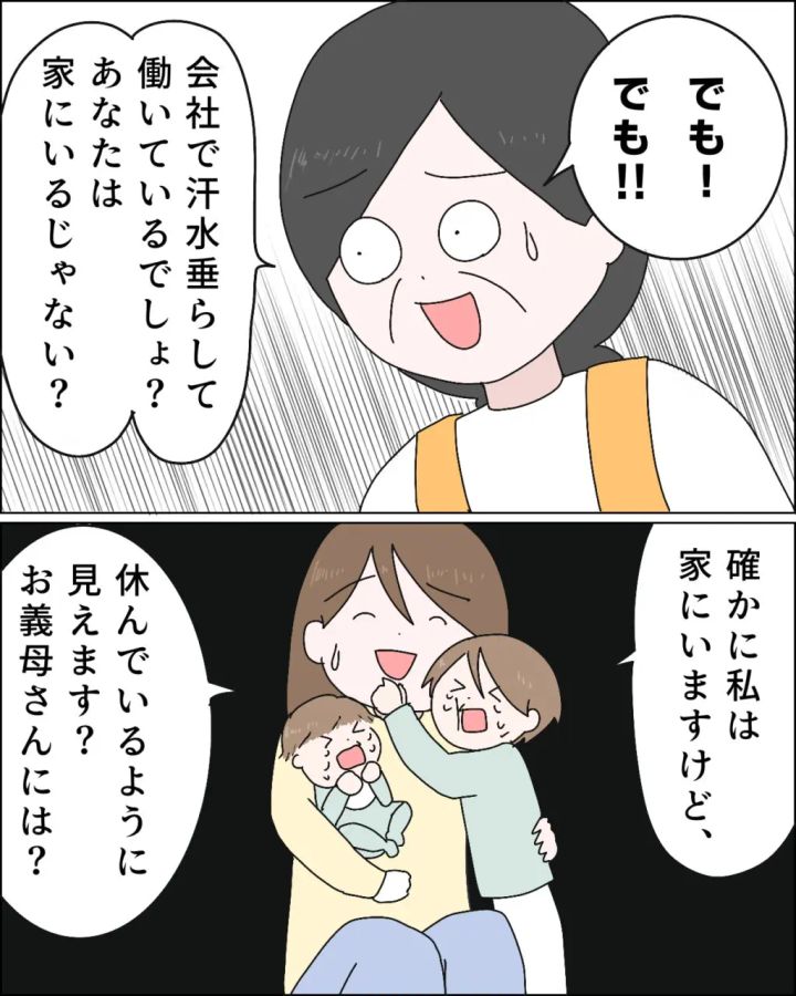 すると、義母はなぜか「でも!!」と必死になって「会社で汗水垂らして働いているでしょ?あなたは家にいるじゃない?」とユキヒロをどうしても大黒柱と認めさせたい様子。「確かに私は家にいますけど、休んでいるように見えます?お義母さんには?」とたまらず言ってしまいました。