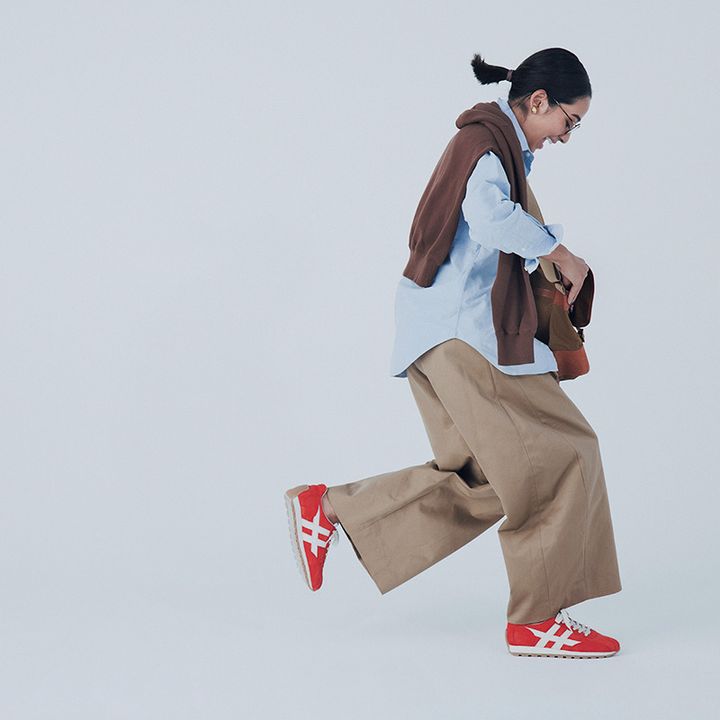 色褪せたようなレトロな赤で トラッドコーデが新鮮に。 いつものゆるパンツが垢抜ける