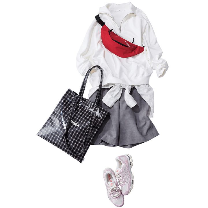 ヘルシーなハーフパンツは キレイめスウェットで大人に。 スニーカー&小物で差し色を