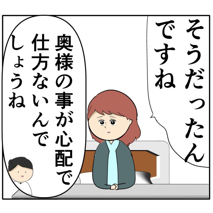 離婚についての話し合いの途中、溜め込んでいたストレスにより体調を崩して入院することになってしまっためいさん。入院中、めいさんは着替えなどの荷物を届けに来たろみ緒さんの様子を看護師さんから聞きました。看護師さんによると、病院にやってきたろみ緒さんは真っ青な顔をしていて、心配になった看護師さんが声をかけると「僕はいいんです。妻の体調はどうですか。僕に出来る事ありますか。何でもします。お願いします」とめいさんの体をとても心配していたといいます。めいさんは「奥様の事が心配で仕方ないんでしょうね」と話す看護師さんの言葉を心ここにあらずといった感じでボーッと聞いていました。