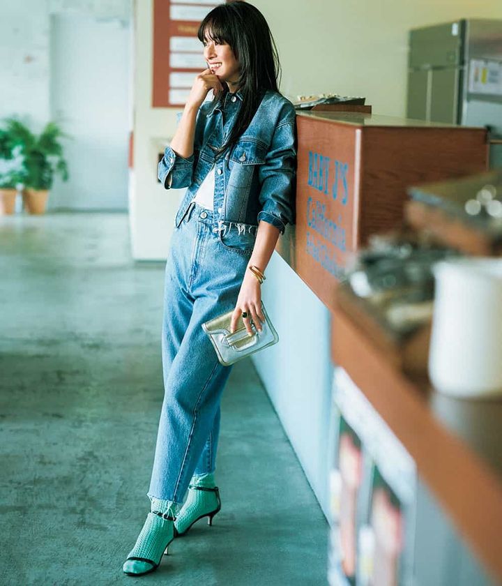取り入れるだけで断然今っぽくなる、ひと癖ソックス合わせ。着慣れたデニムセットアップが足元でフレッシュに!グリーンの濃淡でこなれ感を演出。