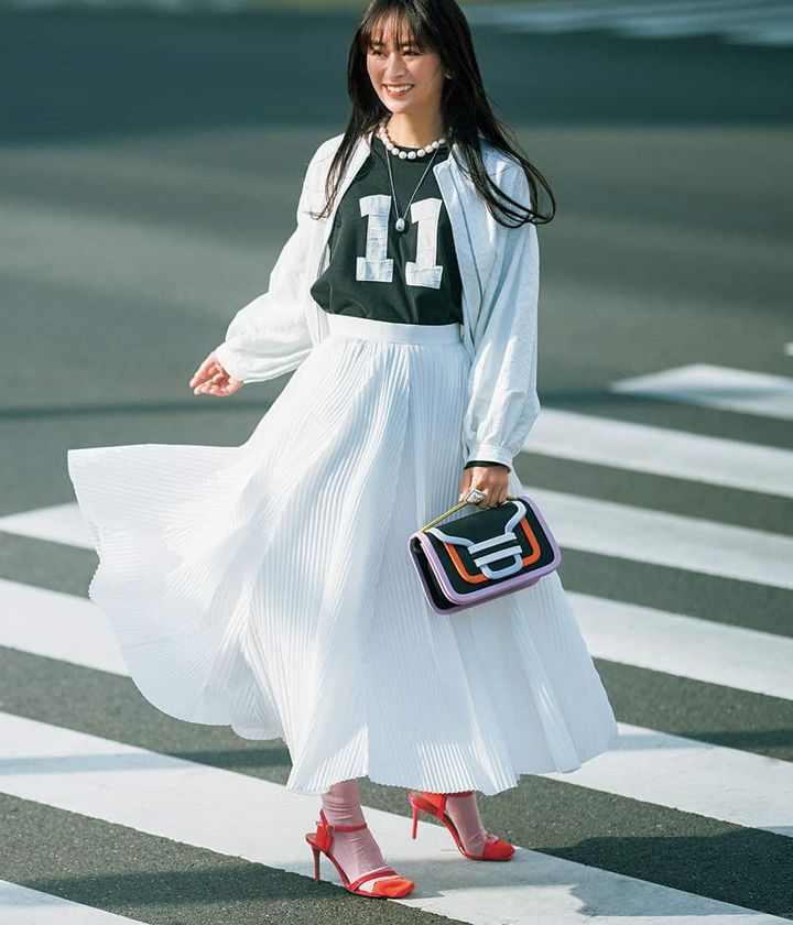 ピンク×オレンジソックス¥3,300(パンセレラ/真下商事)サンダル¥79,200(ペリーコ/アマン)ブルゾン¥79,200(J&M デヴィッドソン/J&M デヴィッドソン カスタマセンター)ナンバーTシャツ¥28,600(RHC/RHC ロンハーマン)プリーツスカート¥39,600(ルル・ウィルビー/アルアバイル)バッグ¥187,000(ピエール アルディ/ピエール アルディ 東京)パールネックレス¥181,500シルバーネックレス¥143,000(ともにソフィー ブハイ/エスケーパーズ アナザーワールド)リング¥134,200(ノアーク/エスケーパーズオンライン)