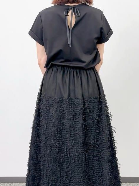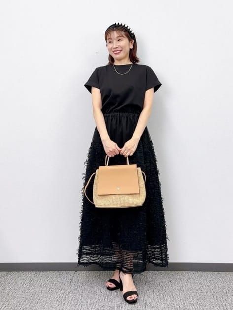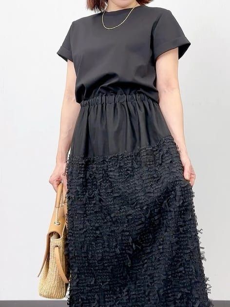 ハリのある上質素材とチュールの透け感が絶妙にMIXされた黒のドッキングワンピ。ウエストの位置も高めなので、スタイルアップ効果も抜群です。足元からのぞくシアーの透け感が女っぽさを演出しつつ、黒まとめでシックな印象に。かごバッグを投入すれば、ちょっとしたお呼ばれにも対応できる華やかコーデに昇華します。