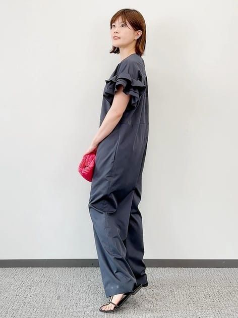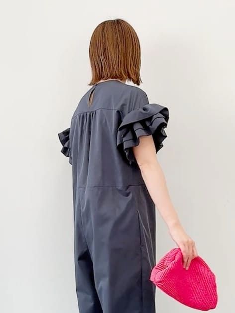 マットな質感と撥水素材で機能性にも優れたオールインワン。袖にあしらわれた2段フリルが上半身に華やぎを添え、カジュアルすぎずに着こなせます。1枚でこなれた雰囲気に仕上がります。フラットサンダルでも美バランスが叶う計算されたシルエットも魅力的。ビビッドなクラッチを効かせてアクセントにすれば、パーティーやディナーにピッタリの着こなしに。