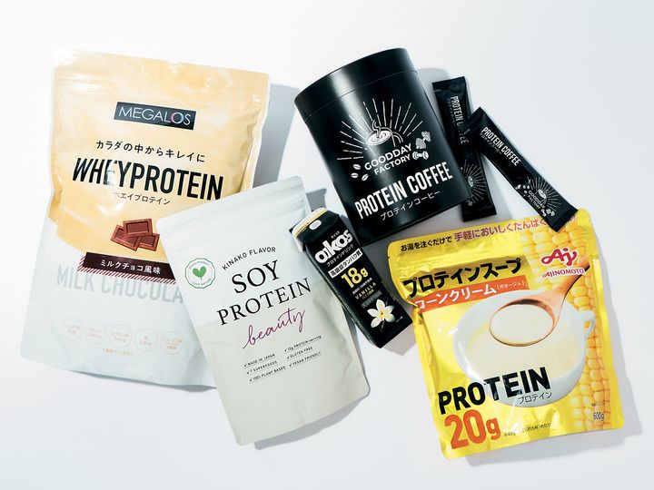 (左から)【おやつ代わりに!】食物繊維やビフィズス菌、鉄やビタミン配合なのも◎。メガロス ホエイプロテイン ミルクチョコ風味 800g ¥4,235(野村不動産ライフ&スポーツ)【ごはん代わりに!】大豆&そら豆を原料にした植物性。ソイプロビューティ きな粉味 200g ¥3,780(ハリウッド)持ち歩きに便利な紙パックタイプ。ダノン オイコス プロテインドリンク 高吸収タンパク質18g バニラ風味 ¥258 編集部調べ(ダノンジャパン)【コーヒー代わりに!】UCCコーヒー鑑定士が監修した本格的なコーヒー味。メガロス プロテインコーヒー 30包 ¥3,980(野村不動産ライフ&スポーツ)【スープ代わりに!】お湯でサッと溶ける濃厚スープ。味の素KK プロテインスープ コーンクリーム 600g ¥2,998(味の素)