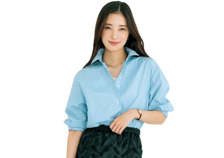シャツ/着回し タンクトップ¥1,290/GU スカート¥8,800/オペーク ドット クリップ イヤリング¥9,900/マージョリー・ベア(ココシュニック 新宿タカシマヤ店) チョーカー¥4,860、時計¥13,200/ともにアビステ バッグ¥9,350/アパート バイ(アダストリア) パンプス¥17,050/ダイアナ(ダイアナ 銀座本店)