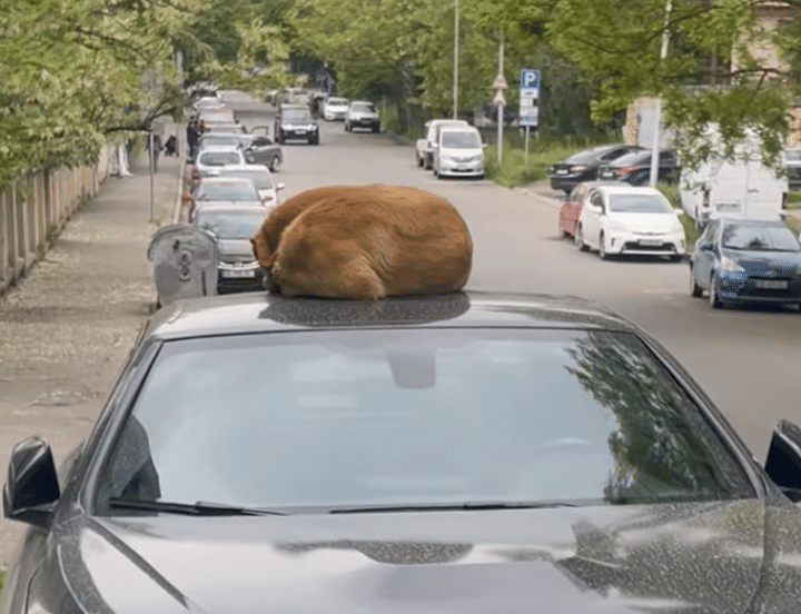 停めてある車の上で丸くなっているモフモフの姿。