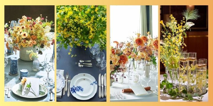 イエローやオレンジ、ライムグリーンなどのビタミンカラー。鮮やかな色の花々は会場をぱっと明るくしてくれ、ウエディングらしい華やかさを演出。