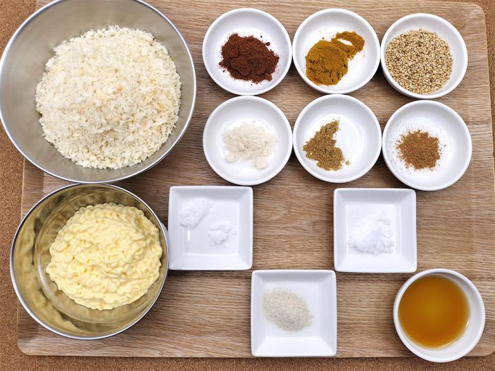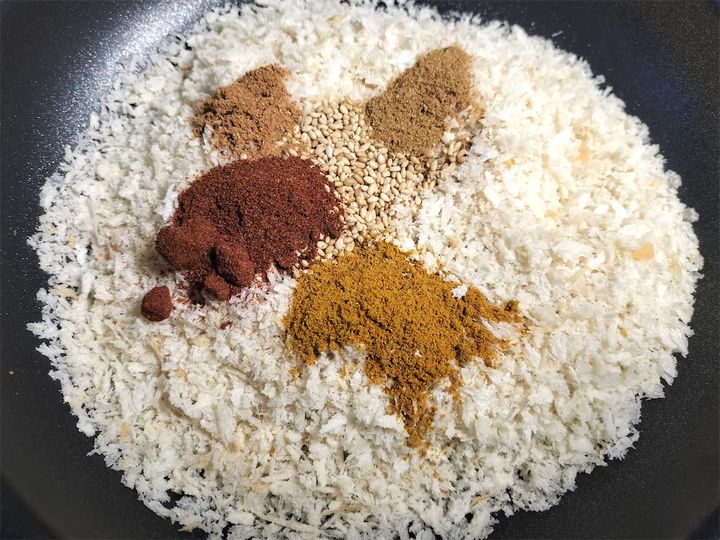 フライパンにパン粉、白ゴマ、カレー粉、一味唐辛子、クミン、五香粉を入れ、弱火で混ぜながら、水分が飛んでサラサラになるまで加熱します。