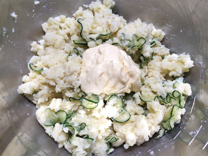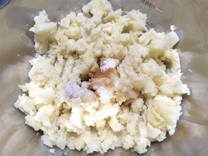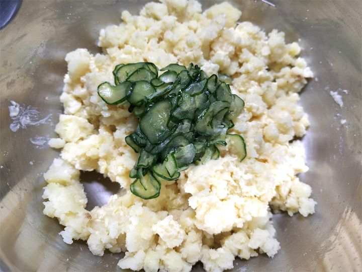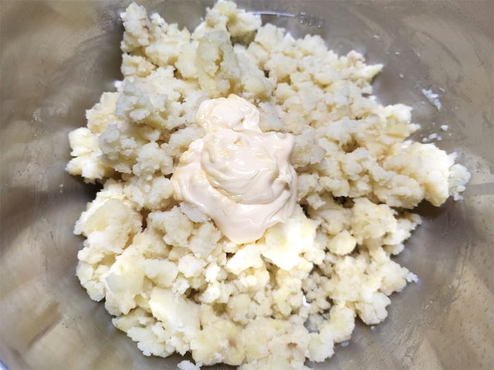 5. ボウルにじゃがいもを入れ、粗熱を取りながら少し粒が残る程度までつぶします。