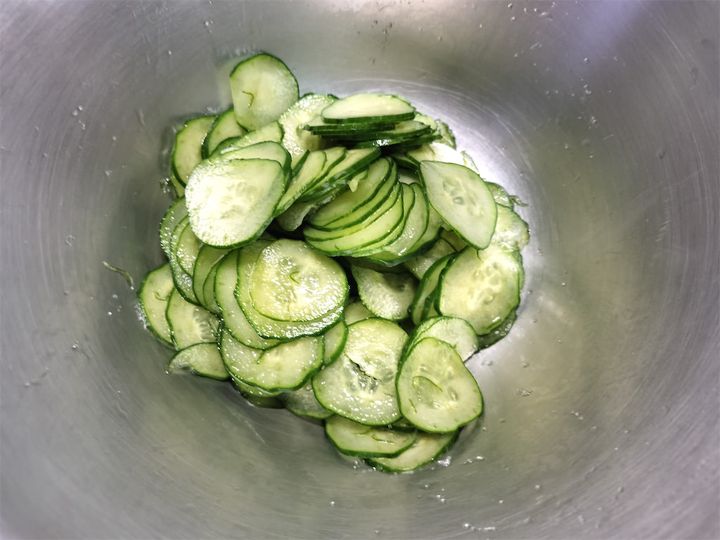 2. きゅうりを塩もみし、水気をよく絞ります。