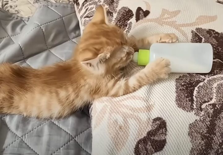 3. 哺乳瓶を抱えてゴロ〜ン! リラックス全開の子猫さん