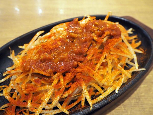 鉄板でじゅうじゅう音を立てるビジュアルにテンションUP。でも、辛さもUP。唐辛子の粉が大量すぎて、吸い込むとむせそうなので要注意。ここで初めて救済ドリンクの出番です。