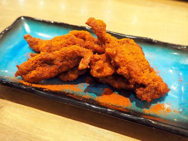 テーブルに運ばれた瞬間、唐辛子の粉が空中に舞うほど! これはヤバそう…。1本食べたら、うん、けっこうきます。でも粉が薄めのところを選べば大丈夫(たぶん)。