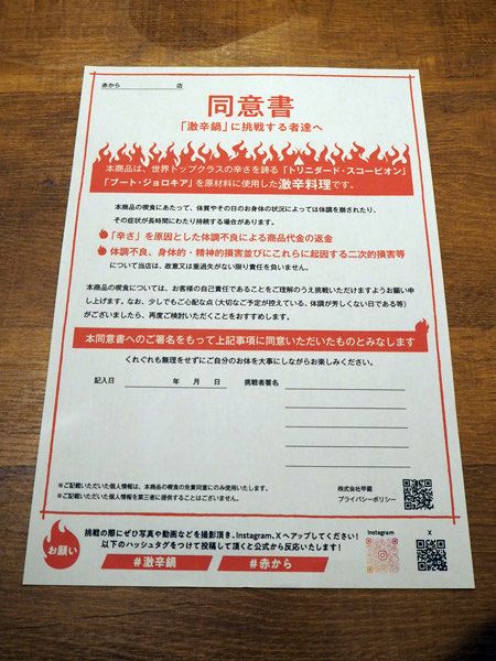 注文して最初にするのは、「自己責任で激辛に挑みます」という同意書へのサイン(笑)。ここからすでに“ただの食事”じゃない雰囲気が漂います。