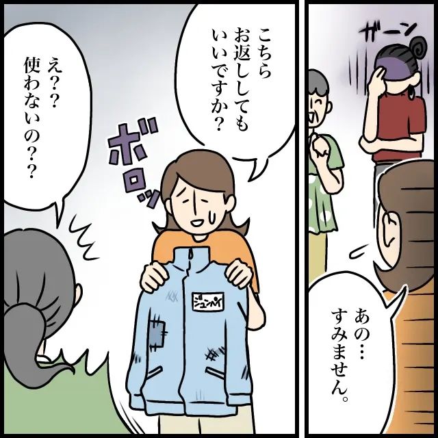 義姉と義母のやりとりを聞き、「あの・・すみません」と言うと、「こちらお返ししてもいいですか?」と差し出したのは、ボロボロになったジュンペイの中学校の体操服でした。それを聞いた義母は「え??使わないの??」と驚きます。え!こっちが驚くわ。