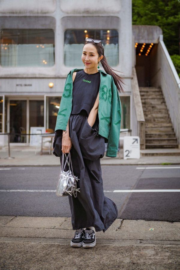 汚れが付いても掃うだけで汚れが落ちるナイロンミックス素材のワンピースは動きやすく運動会コーデにぴったり! ワンピースは下からの風通しがよく、暑い運動場は快適に過ごせます。スカート部分の大きめポケットがカジュアル見えしてお気に入りです。カーキのジャケットとタンクトップのGANNI(ガニー)のロゴをグリーン系で合わせ、シックになり過ぎない夏前のファッションを楽しみます。