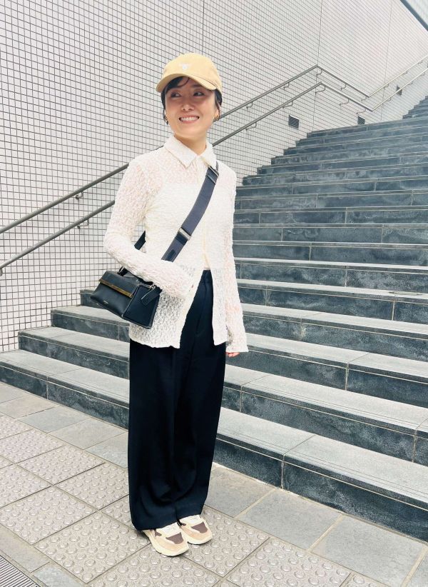 親子競技は毎年全力で走りたいので動ける服装がマスト! パンツはヨガやトレーニングウェアの人気ブランドで伸縮性は抜群です。裾がフレアになっているので足長効果があり、カジュアル過ぎないので私立の運動会でも履いていきます。シアー感のあるトップスは抜け感があり、衿付きなのできちんと感もキープ。赤のラインの入ったバッグを合わせ、シックなコーデを差し色で締めました。