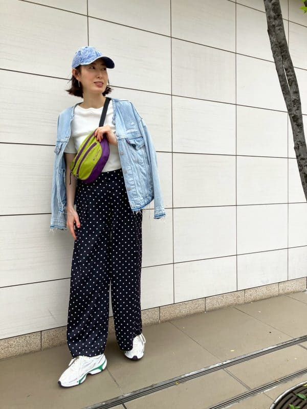3人の子どもが小学校に上がり、3人分の種目を見るため長時間立ちっぱなしに。少しでもリラックスできるように、ストレスフリーの柔らかで涼しいナイロン素材のワイドパンツを合わせました。デニムのキャップとデニムジャケットを合わせて、遠くからでも子供達に気づいてもらえるように、他のママたちと被らないファッションにまとめました。