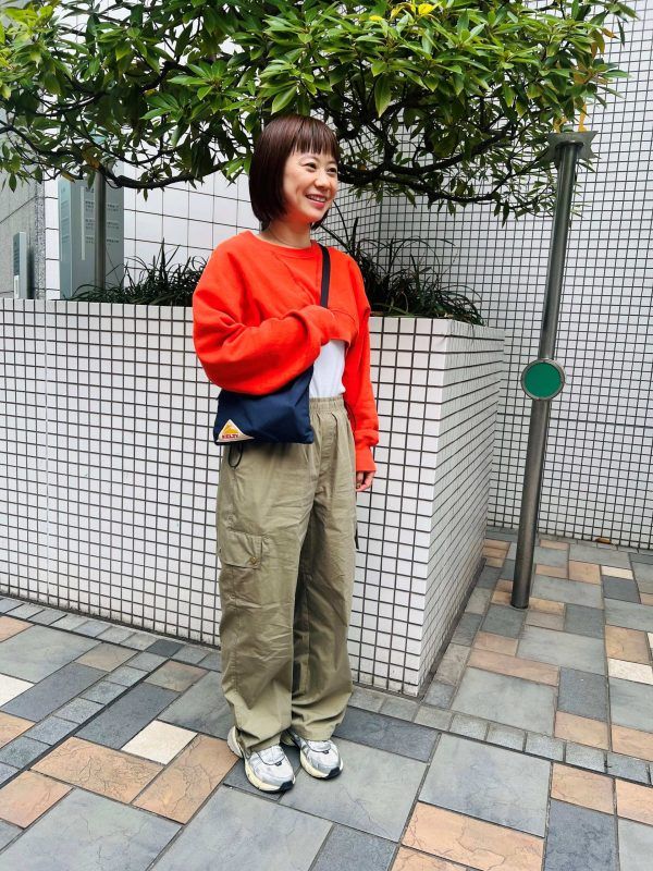親子競技があるので動きやすい格好がマスト! 運動会では大勢集まる園庭の中でもママを見つけやすいように、トップスは明るいカラーの赤のスエットを選びました。短丈のデザインなら家着っぽさを回避しトレンド感も与えてくれます。ボトムスは、砂汚れが付いても目立ちにくい色を合わせ、キレイさをキープできるようにしました。