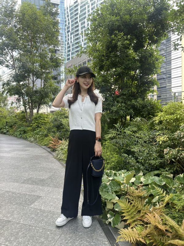 保護者会など学校に行くときはブラックやネイビーコーデがメイン。日差しが強い日は全身シックな色だと暑いので、私立でも運動会だけはホワイトアイテムをプラスします。カジュアルダウンし過ぎないようにニットカーディガンを合わせ、胸元のボタンを少し開けて抜け感を出しました。ニューエラのキャップをオンし、スポーティ感をプラスします。