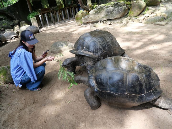 園内には30頭ほどのゾウガメがおり、餌やりだけでなく触れ合うことも可能。