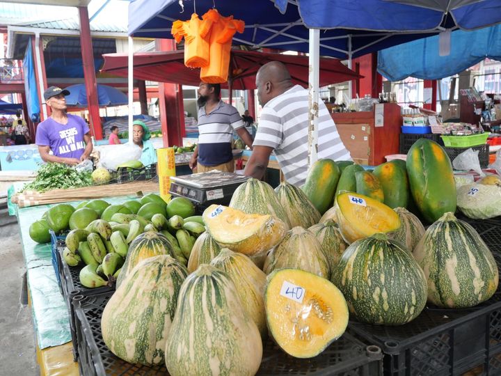 セーシェル産の新鮮な果物や野菜が豊富に並んでいる