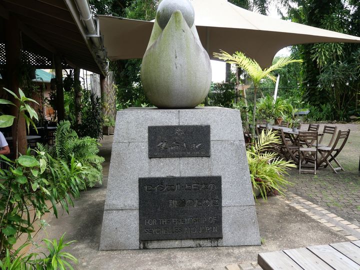 カフェの一角にはセーシェルと日本の親善の証を記念するモニュメントが飾られており、これは1990年に大阪の鶴見緑地で開催された“国際花と緑の博覧会”の際に、セーシェルの自然をボランティアで再現したことを記念して建立されたようです。