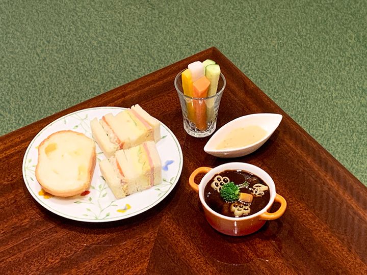 自家製の「チーズブレッド」はふわもち食感やチーズのやさしい味わいが最高。その時々で違う味が楽しめる「本日のサンドイッチ」や、ユズ風味のディップソースをつけて味わう「スティック野菜」はさっぱりとしているのであっという間にペロリ。創業100年を超える老舗・滝沢ハムに「ROYAL CRYSTAL COFFEE」オリジナルでつくってもらっているという「牛ホホ肉の特製ビーフシチュー」も絶品。口に入れた瞬間ほろほろととろけてうま味が広がるぜいたくな味わいに、思わず笑みがこぼれます。