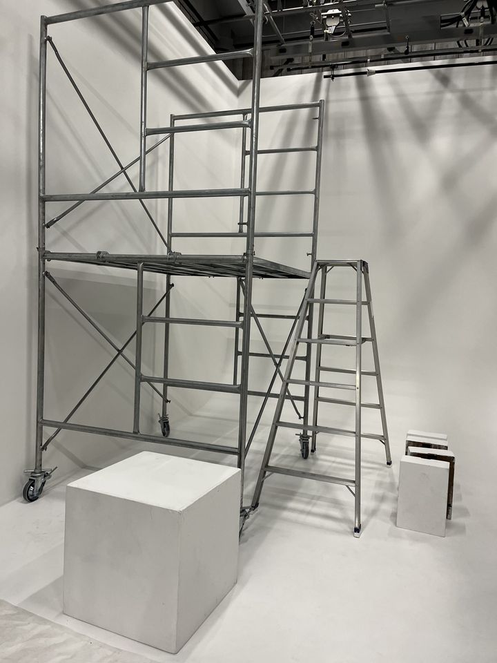 こちらのスタイリングでは、鉄の足場のセットを用意。ソリッドでシャープな空間は、彼らのクールさやビビッドな衣装がより引き立ちます。