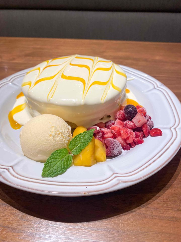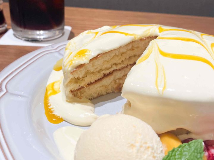南国の逸品「アップルマンゴー&レアチーズクリームのホットケーキ」が提供されると、テーブルの上が一気に華やぎます。レアチーズクリームに覆われたホットケーキはビジュ抜群で、見るからにトロピカル。フルーティーな香りがふわりと漂います♡