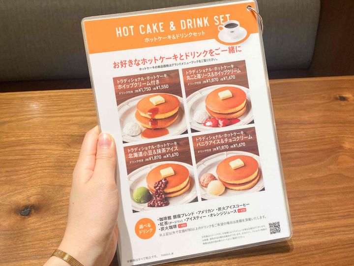店内で焼かれるホットケーキは、1枚と2枚から選べます。食後のデザートとして1人で食べるなら1枚が適切ですが、おすすめはよりインパクトのある2枚重ねです。2枚重ねのホットケーキを1食としたり、デザートとして2〜3人でシェアするのもいいでしょう。
