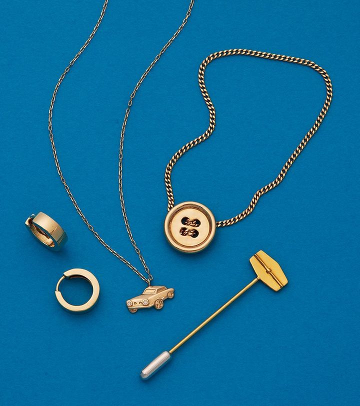ピン¥47,300、ボタンチェーン¥64,900(共にアクセップ)、フープピアス¥121,000(ベッティーナ ジャヴァエリ/ロンハーマン)、ネックレス¥181,500(サンズ サンズ/全てRHC ロンハーマン)