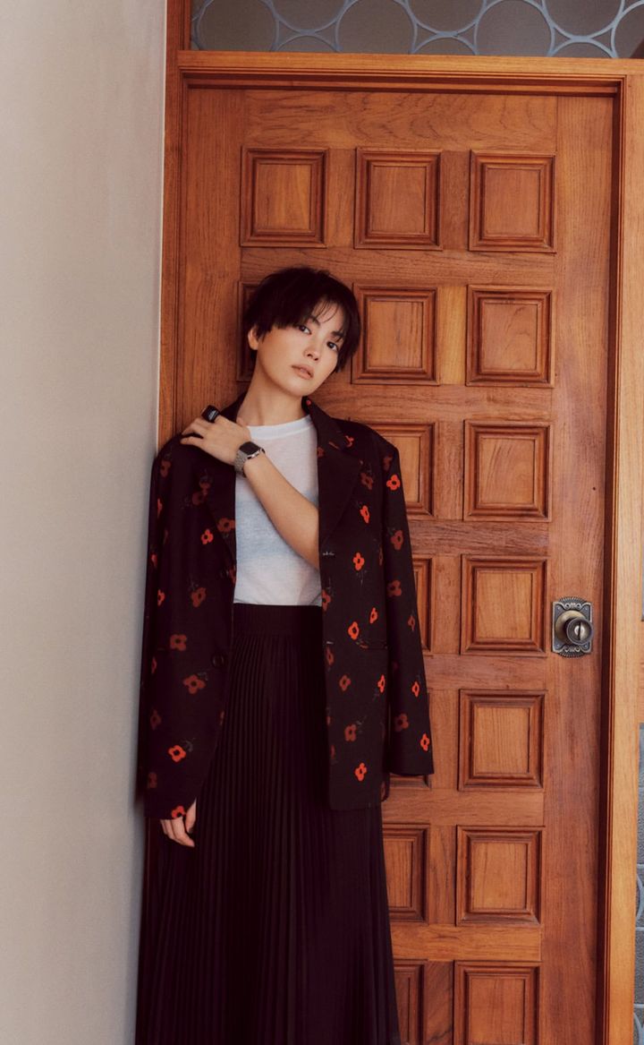 ジャケット¥29,700(Higuchi Kaori × Spick & Span/スピック&スパン ルミネ有楽町店)、Tシャツ¥9,900(イウエン マトフ/ユナイテッドアローズ 渋谷スクランブルスクエア店)、スカート¥44,000(ハイク/ボウルズ)、リング¥145,200(ソフィー ブハイ/エスケーパーズ アナザーワールド)、時計¥7,150(カシオ クラシック/カシオ計算機 お客様相談室)、その他はスタイリスト私物