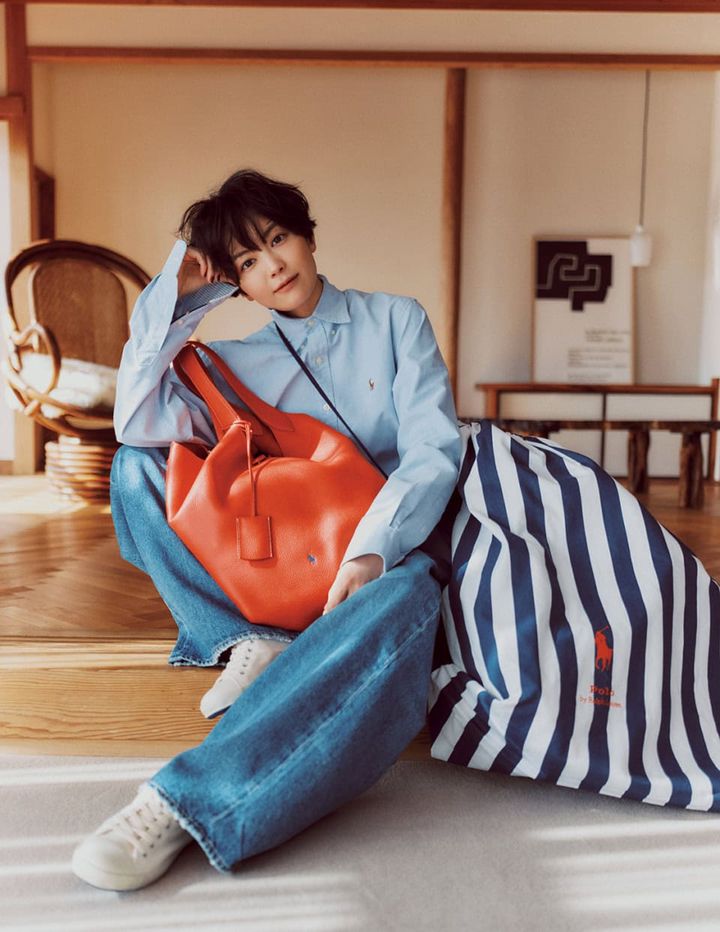 シャツ※メンズ¥23,100、デニムパンツ¥41,800、レザーバッグ¥137,500(全てポロ ラルフ ローレン/ラルフ ローレン)、その他はスタイリスト私物