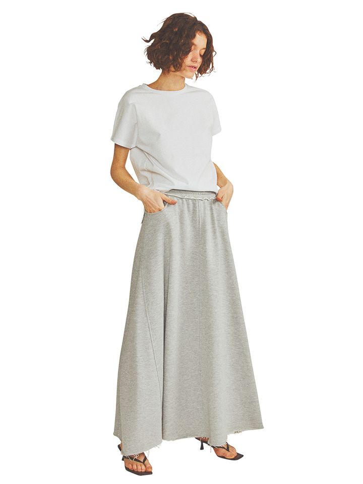 【POINT】パンツからスカートに変えてTシャツ+スウェットを品行方正に。ボリューム感に対してやぼったさがない、適度な重みのスカートだから、コンパクトなTシャツと合わせるだけで自然とメリハリのついた見た目に。