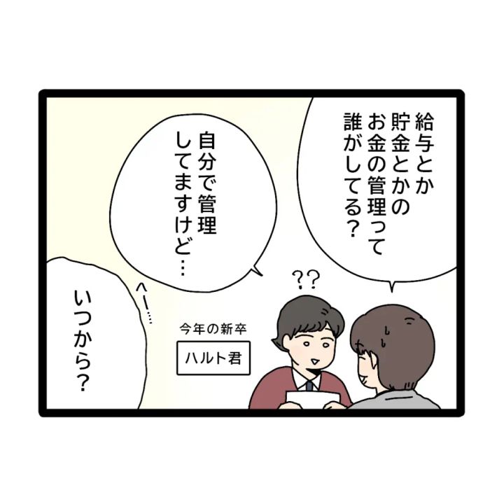 ハルト君は今年新卒で入社した社員です。「給与とか貯金とかのお金の管理って誰がしてる?」とコウタさんが聞くと、ハルト君は不思議そうな顔をしながらも「自分で管理してますけど・・」と当然といった感じで答えました。予想外のハルト君の返答に内心驚きつつ「へー・・いつから?」と平静を装いつつ質問を重ねるコウタさん。
