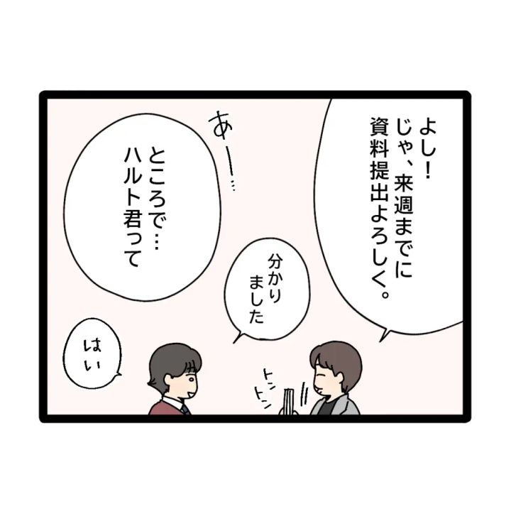ハルト君は周りを見回すと、「あっ」と言ってスタスタと先輩社員のかがみさんのところへ歩き出しました。