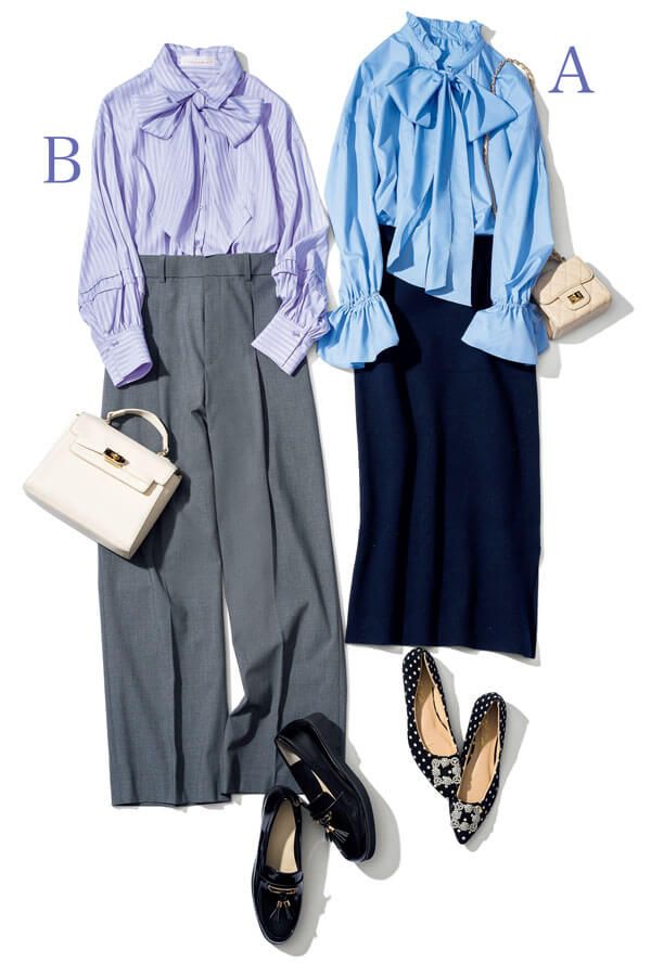 すとんと落ちるスカートで甘ボウタイを受け止めて。ほどよいハリ感でボリュームがあるボウタイブラウスに対して、ニットスカートはシンプルなIラインを選んでメリハリづけ。ブルー×ネイビーのワントーンで、お仕事で信頼させる清潔感も備えて。