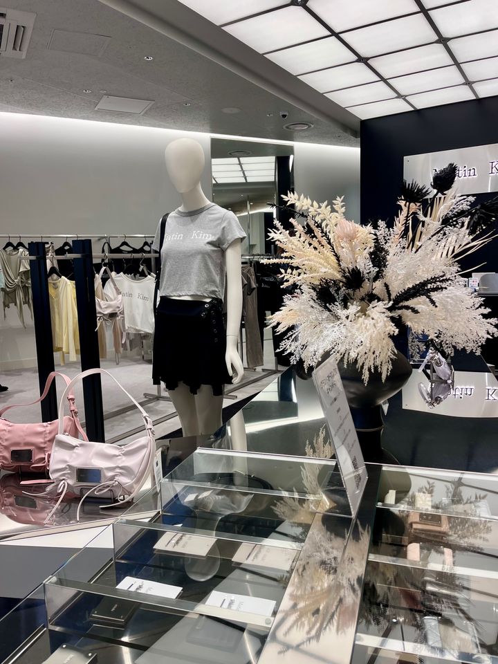 店内中央に大きくディスプレイされているマネキンが来ているのがMATIN KIM東京限定カラー、グレーのクロップTシャツ。