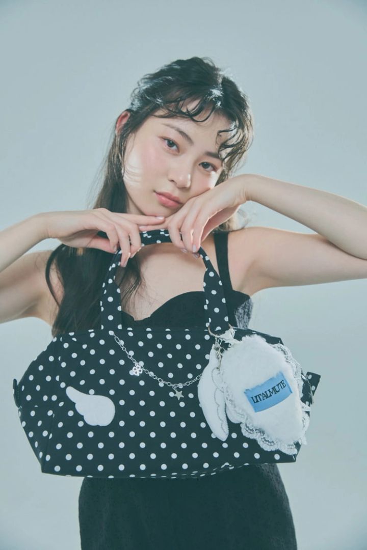 ドット柄羽根モチーフつきバッグ 7,590円、羽根チャーム 3,200円/ともにLITALMUTE 黒ミニワンピース 22,000円/The Girls Society